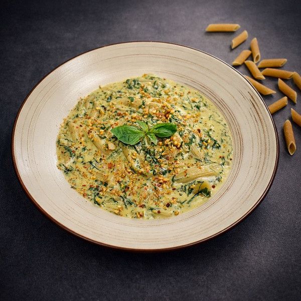 Creamy garlic spinach pasta packed with leafy-green nutrients and fiber, delivering a rich and comforting bowl.
